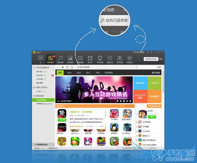 安装游戏软件后,在设备上如果出现闪退现象,可通过91助手的【软件闪退修复】功能进行一键修复。