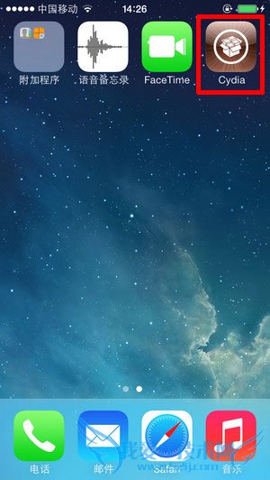 6.设备自动重启后,请拿起您的iOS设备,按Home键,滑动解锁,就可以看到如下图标Cydia。