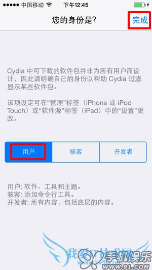 9.设备自动注销后,请拿起您的iOS设备,按Home键,滑动解锁,再打开Cydia,选择【用户】,点击右上角【完成】按钮,Cydia会自动加载源及相关数据。这时您已经可以点击evasi0n上的按钮【Exit】安全退出电脑上的越狱工具。