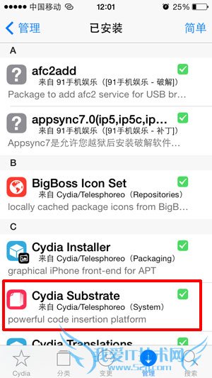11.为了保证越狱后设备正常使用,必须手动安装appsync和afc2add补丁以及更新依赖包Cydia Substrate,安装教程如下: