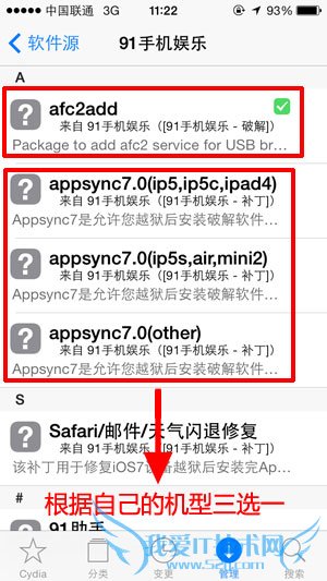 3.越狱后安装afc2add补丁可能会容易使设备白苹果(请重洗刷机后,使用91助手纯净版越狱工具)
