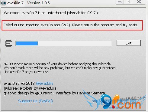 2.如果越狱过程在某个流程卡住了,可以进行以下操作让程序继续运行:重启evasi0n7程序,并重启设备(如果有必要的话,可以同时按住Home键和电源键,直到设备停止运行)