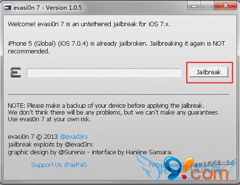 ③已越狱又想升级重新越狱的用户:先备份数据再使用iTunes升级到最新版本7.0.5(目前只支持iPhone 5c/5s),然后下载evasi0n7 v1.0.5进行越狱。不要在没有刷机的情况下,直接使用1.0.5进行重复越狱,会出现副作用。(点击查看升级刷机教程)
