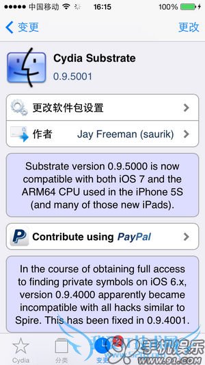 提示:Mobile Substrate是Cydia插件/软件运行的一个基础依赖包。越狱后安装的插件或软件几乎都是依赖Mobile Substrate才能运行的。所以它是越狱后必装的!目前已改名为Cydia Substrate。