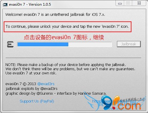 4.然后进入如下界面 “To continue,please unlock…”,这时请拿起您的iOS设备,按HOME键,滑动解锁设备,找到如下图标evasi0n 7,点击它。