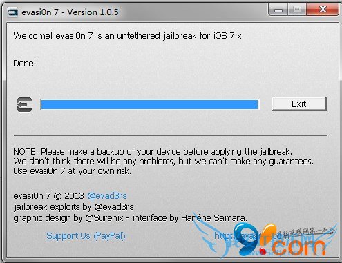方法一、使用 evasi0n7 1.0.5 进行 iOS 7 完美越狱
