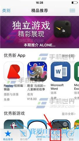 1)打开iPhone6Plus的【App Store】,这里有多种途径可以下载软件,小编就以【搜索】为例。