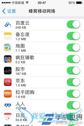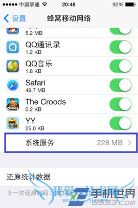 3)在蜂窝移动网动里我们可以清楚每一个应用程序所用的网络流量。在应用程序图标的右边有一个开关,可以打开或关闭此应用程序对蜂窝移动网络的访问,然后我们还可以查看系统使用的网络流量统计数据,点击底部的“系统服务”选项查看流量使用明细。(如下图所示)