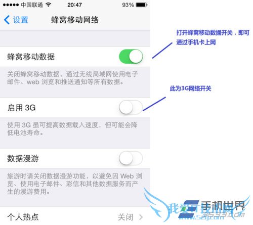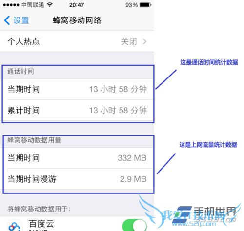 2)在“蜂窝移动网络”设置里,可以打开蜂窝移动数据通过手机卡上网,还可以在这里打开3G网络,接下来是手机通话时间统计和流量统计数据。(如下图所示)