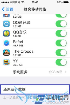 4)然后就可以看到系统服务所使用的网络流量明细列表了,若要还原统计数据,请点击“蜂窝移动网络”设置列表最底部的“还原统计数据”选项,最后再点击“还原统计数据”即可。(如下图所示)