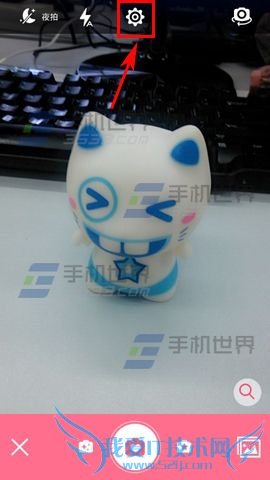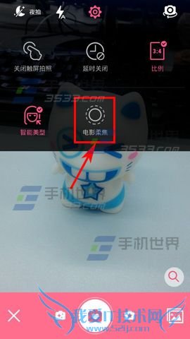 2)跳转到拍照模式后,点击上方的【齿轮】按钮,弹出选项,点击【电影柔焦】。(如下图)