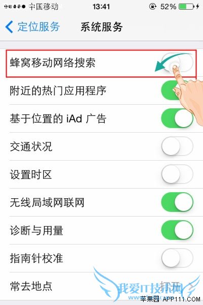 第三步,在定位服务页面,点击进入“系统服务”页面,用户可以选择关闭不必要的选项,如“蜂窝移动网搜索”、“交通状况”、“设置时区”等。
