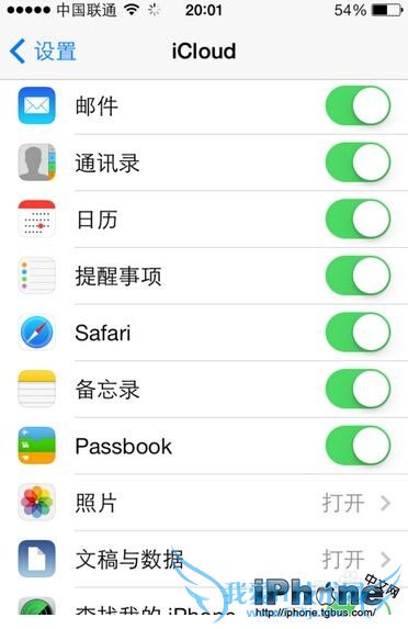 5、就这样打开了 iCloud 服务,可以看到在我的 iCloud 里邮件、日历、备忘录、Safari 等选项都已经打开,说明这些应用上的内容都可以自动同步到这部手机上。