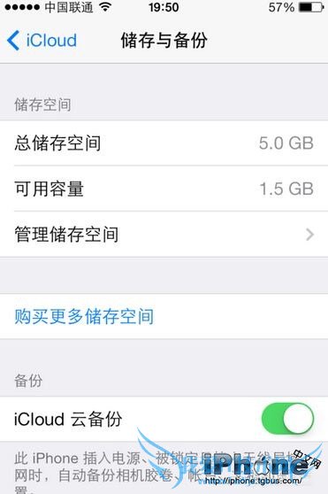 6、另外需要说明的是,免费的 iCloud 账户默认只有 5G 的空间。在 iCloud 底部点击“储存与备份”选项,可以查看具体的空间使用情况,如图所示