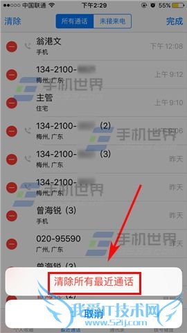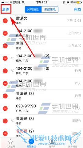 2)打开后我们即可自由删除个别号码或者点击左上角的【清除】进行【清除所有最近通话】。(如下图)