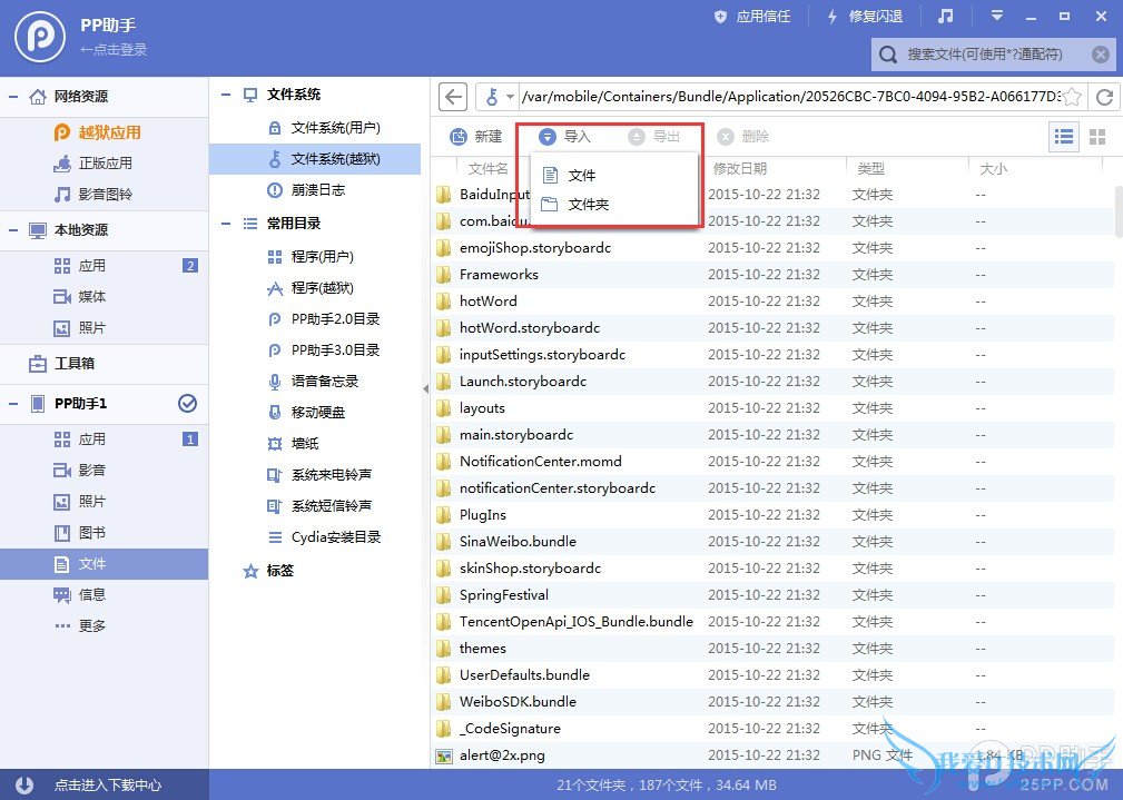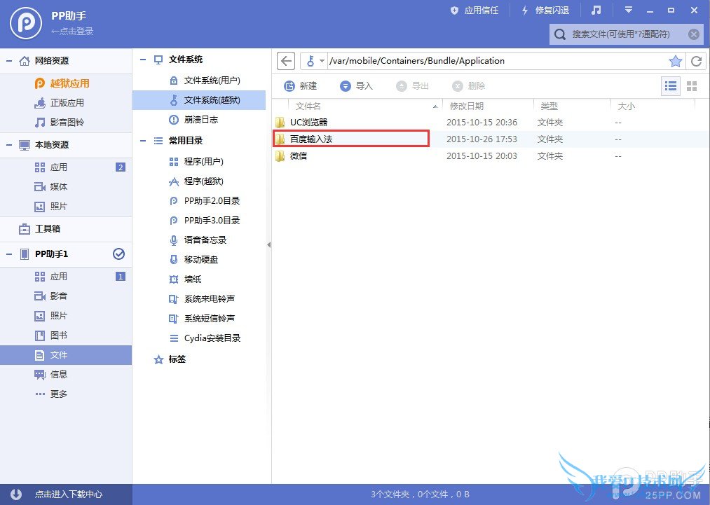 3、设备连接PP助手电脑版,将下载好的文件导入路径【/var/mobile/Containers/Bundle/Application/百度输入法/BaiduInputMethodContainer.app】