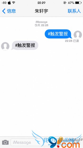 “发信人”可以空着不写,“信息内容”可以自定义,例如填写“#触发防盗”
