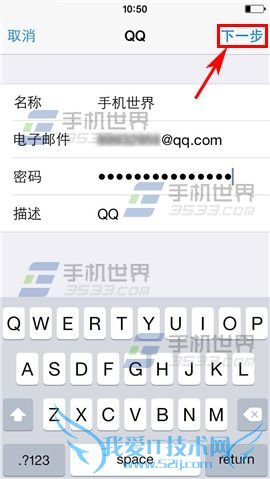 1)打开iPhone6的【邮件】,选择要设置的邮箱,小编以【QQ邮箱】为例,输入【名称】【电子邮箱】【密码】,【描述】系统自动会匹配,完成后点击【下一步】。