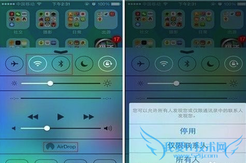 接下来我们继续关东西,熟悉iOS 7的用户都知道我们只需要从手机底部向上滑动就可以拉出快捷键的功能菜单,虽然很实用,但是里面诸如“Wifi、蓝牙、AirDrop”等无线通讯在不使用时最好保持在关闭状态,其中AirDrop功能是用于在多台设备支架分享文件用的,我们只需要将文件拖动到使用该功能的好友的头像上就可以进行一对一的额文件传输,但是耗电也是非常大的,所以在不实用的情况下我们还是关闭为好。(PS:AirDrop功能目前仅支持iPhone 5以上的设备)。