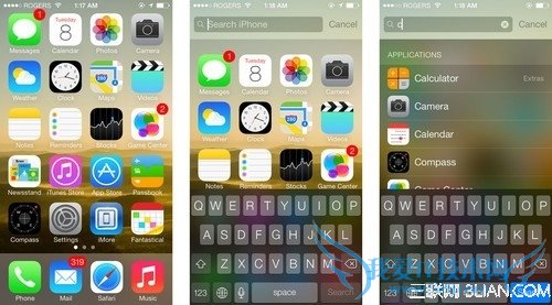 最后一项手势操作在于调出搜索界面。在之前的iOS6系统中,我们都是需要在主界面向右滑动界面来调出搜索界面,而现在我们仅需要在主界面屏幕上用手指向下滑就可以调出搜索界面,搜索功能可以快速的帮你定位到相关的App上以及信息上,非常实用的小工具。