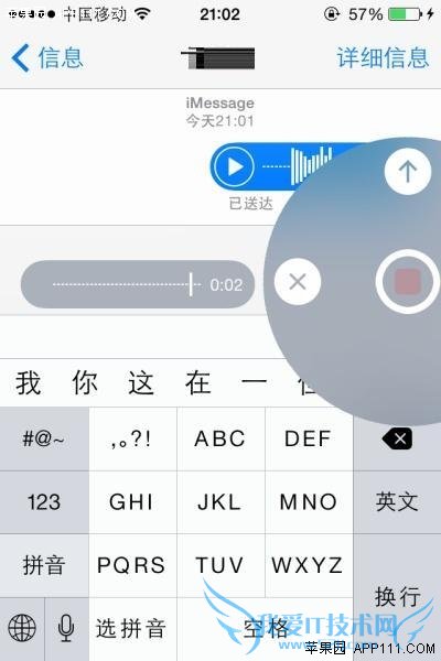 第二步,点按录音按键片刻,即可进入录音状态,显示相应的操作按键。可以对着手机说出要发送的语音信息。