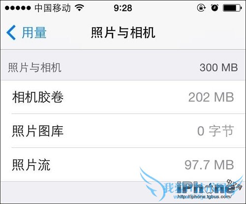 此列表显示了相机胶卷、照片图库和照片流都占用了多少空间,但是,却不能单独删除。删除照片最快的方法是连接到iTunes,导入照片,然后删除。