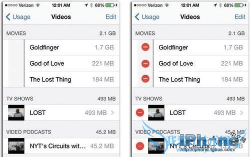 点击右上角的编辑按钮,就会出现红色的删除按钮,如上图右侧的图片所示,现在你可以动手腾出一些空间了。