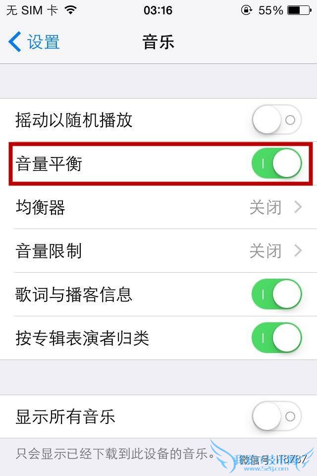 第二步,在音乐选项页面,开启“音乐平衡”功能即可。因为“音量平衡”可以自动侦测所有歌曲的音量,然后调查至大约差不多的水平。
