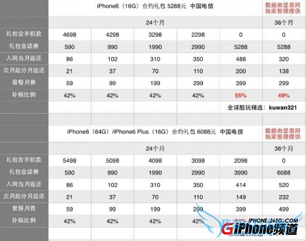 对于电信版本来说,电信推出了iPhone 6和iPhone 6 Plus合约套餐包,合约价分别是5288元和6088元起,合约计划24个月起,399元套餐享0元购iPhone 6的优惠,iPhone 6 Plus则是499元套餐两年可享受0元购iPhone 6 Plus的优惠。补贴力度比去年的5s和5c高,从42%到55%不等。
