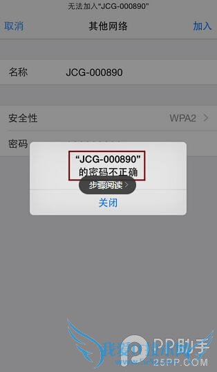 7.如果安全性选择错误或者密码输入不正确,iPhone会给出错误提示,这样您需要重新选择正确的安全性并且输入正确的WiFi密码才能再次尝试连接。