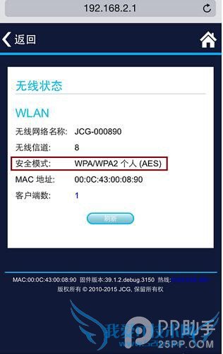 3.在手机设置之前,需要牢记路由器设置的无线名称和密码,以及路由器设置的WiFi加密方式。这款JCG无线路由器并没有显示采用的是什么加密方式,但一般情况下都是WPA/WPA2混合加密的。事实上,当我进入“系统信息”-“无线状态”查看的时候,确实是WPA/WPA2混合加密的安全模式,这也是很多路由器常见的WiFi安全模式。