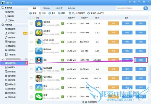 点击左侧的【应用程序】,在右侧找到QQ,然后点击最后面的【浏览】按钮