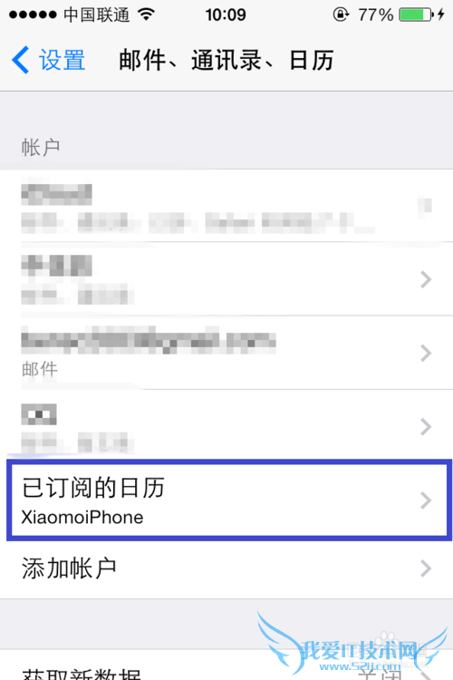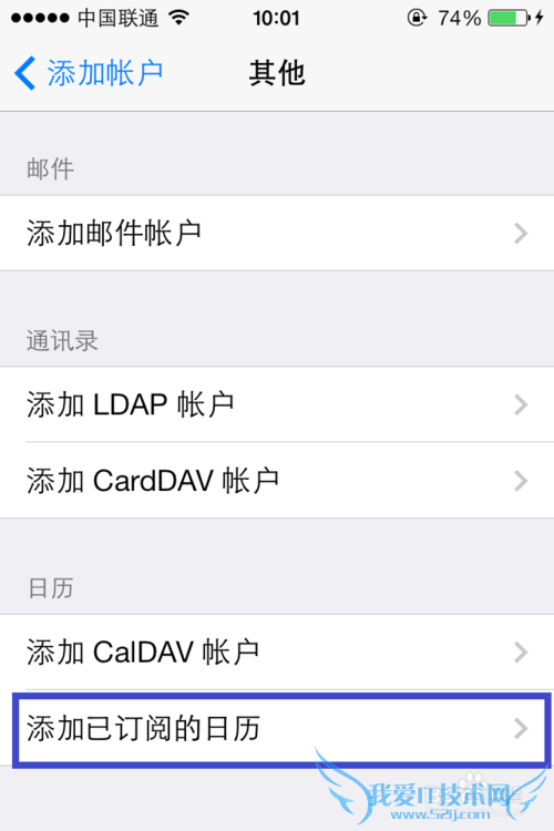 4、在日历设置列表中,点击“添加帐户”选项,如图所示