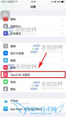 1)点击【设置】,进入后点击【Touch ID与密码】。(注:指纹识别设置方法请参考本文中相关教程)(如下图)