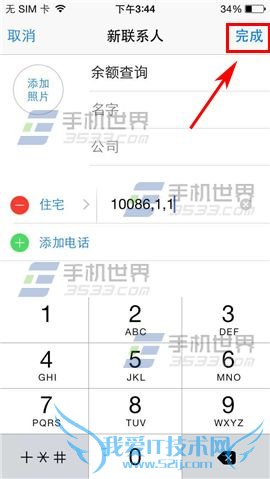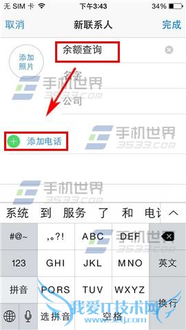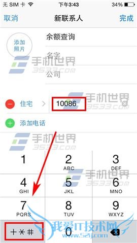 1)在添加新联系人界面输入名字,这里以【余额查询】为例,再点击【添加电话】,输入【10086】,点击【+*#】。(如下图)