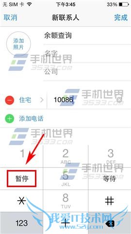 2)点击【暂停】这个时候在电话号码后面就多了一个逗号,这个逗号代表停留2秒时间的意思,输入数字1,然后再一次点击暂停按钮,后面再输入两个1,点击【完成】即可。(注:如果是联通就填“10010,1,1,2”;电信就填“10000,1,1,2”。)(如下图)