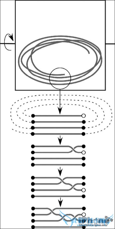 其实,较小的容器是防止打结的最好办法。实验发现,较长的绳子在较小的盒子中时,由于绳子有一种展开的趋势,所以它会紧贴盒子内壁,从而在盒子翻转时绳子末端不会掉到绳子中段缠绕起来。