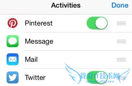 现在,你终于可以重新排列iOS系统中的分享服务列表了,可以把最常用的应用排在最前面。比方说,如果你是Pinterest的狂热用户,把Pinterest放在苹果自带的消息和电子邮件应用之前,就能无需滑动翻页轻松分享至Pinterest。对分享服务列表进行定制很简单,只需在分享菜单弹出时点击“更多”( more)图标即可。此外,底部的“添加书签”或“用作墙纸”等动作的顺序也可以重新排列。