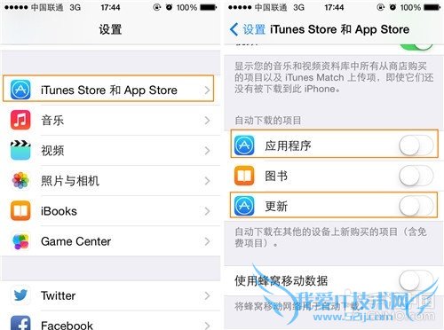 还有就是在“设置”-“iTunes Store和App Store”选项中,关不App的自动下载和自动更新功能。
