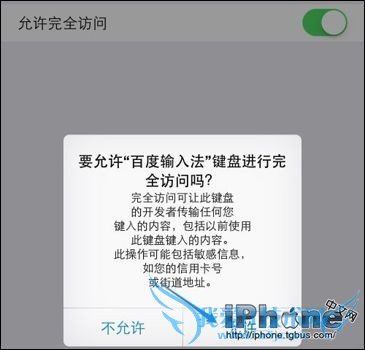 4、随后在输入法列表里,点击打开百度输入法,然后再选择“允许完全访问”这个选项。