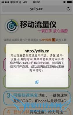 2、进入“设置—通用—日期与时间”,取消自动设置,并将时间调至9月15日或更早。然后打开Safari,输入ydlly.cn,下载移动流量仪。