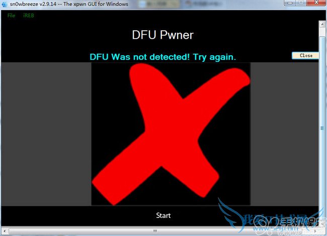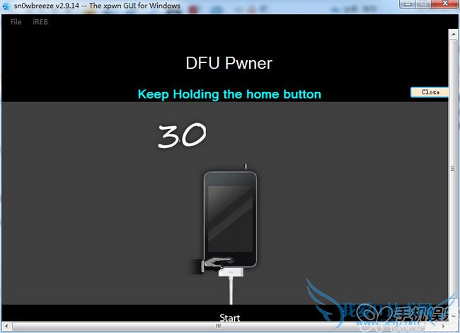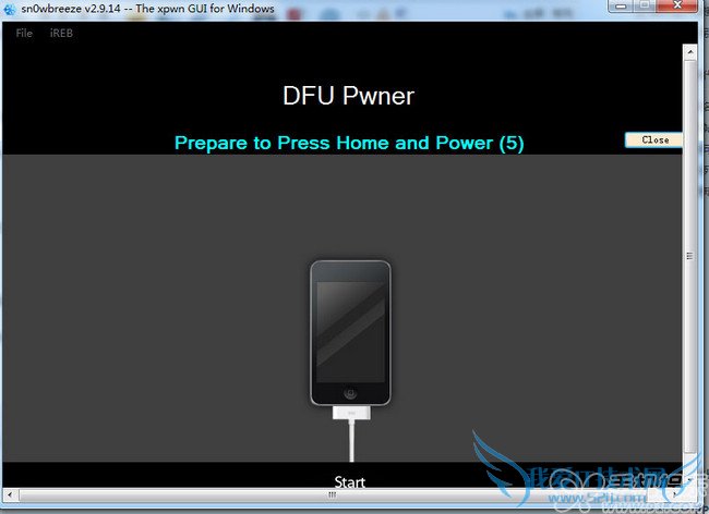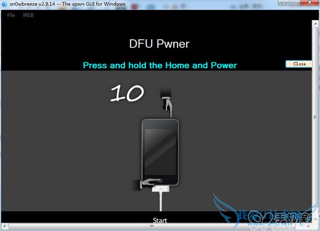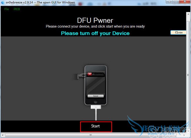 先将iOS设备关机后点击【sn0wbreeze 雪花】降级工具的【Start】按钮,然后按照提示步骤操作: