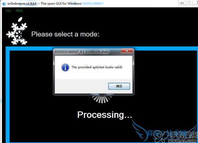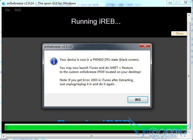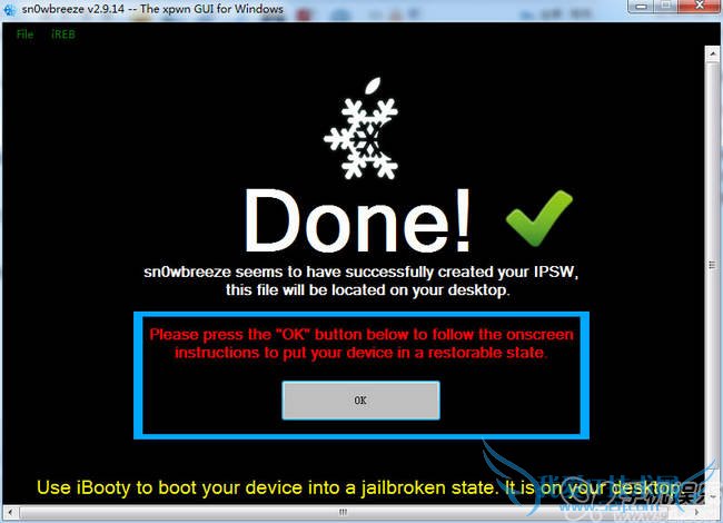 6.制作降级固件成功后将iOS 设备连接电脑并点击【sn0wbreeze 雪花】降级工具点击【OK】