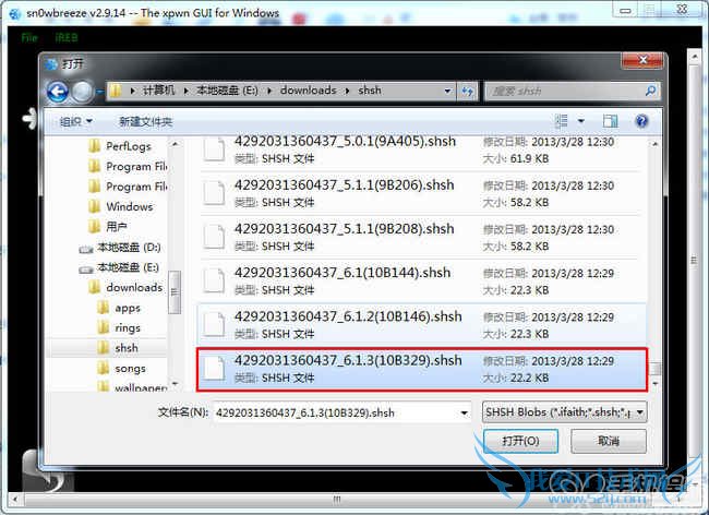 提示:请选择之前添加固件版本的SHSH—【确定】—然后选择本机iOS6.1.3固件的SHSH备份文件。