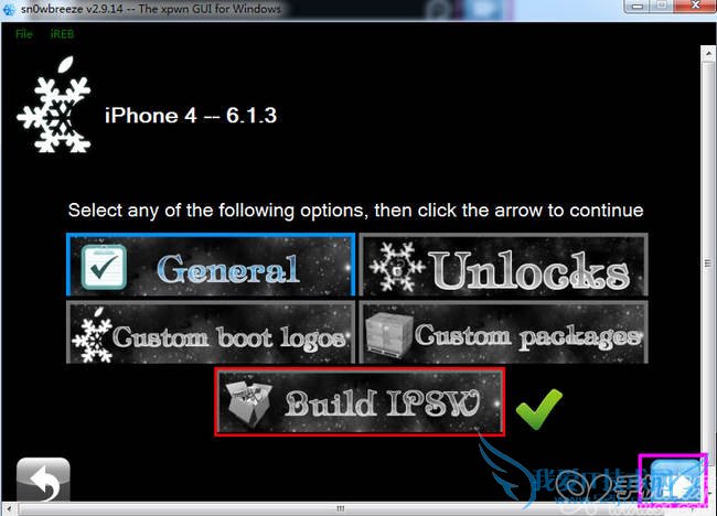 5.选择【Build IPSW】—点击下一步—【sn0wbreeze 雪花】降级工具开始制造的降级固件