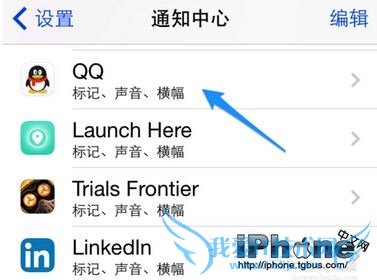 在通知中心列表中找到 QQ 应用一栏,点击进入,如图所示