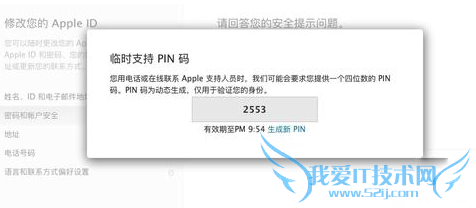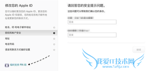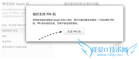 6、值得注意的是,对方在处理问题的时候,可能会需要我们在登录 Apple ID 的页面上生成一个 临时 PIN 码。这个码可以在登录以后的【密码和帐户安全】里,可以看到右下方有一个 PIN 按钮。