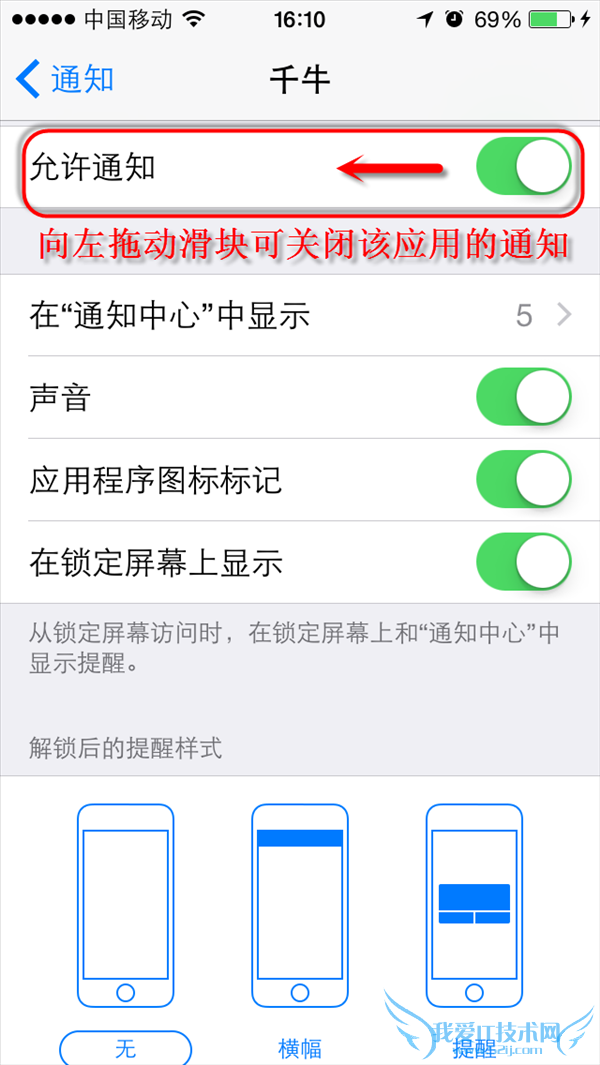步骤2:向左拖动最上方“允许通知”的滑块,就可以关闭通知。也可以重新设置解锁后的提醒样式,这样就不会在锁屏状态下收到通知的文字提示了。