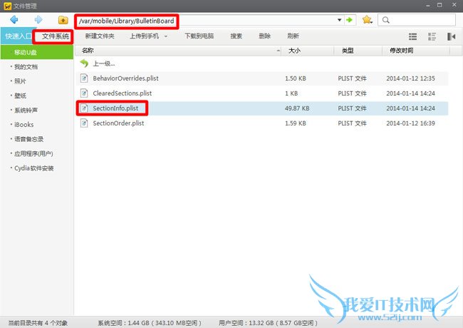 5.将刚刚在第二步中下载下来的替换文件SectionInfo.plist拖入文件系统目录/var/mobile/Library/BulletinBoard中去,将原文件SectionInfo.plist替换掉。