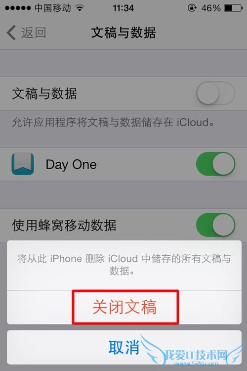 5、在提示“将从此iPhone删除iCloud中储存的所有文稿与数据。”选项中点击“关闭文稿”。这样就可以禁用掉iCloud同步选项中的iWork套件了。